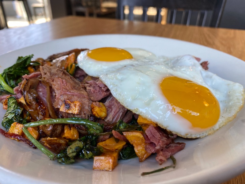 Corned beef, potatoes, sweet potatoes, caramelized onions, kale and two eggs.