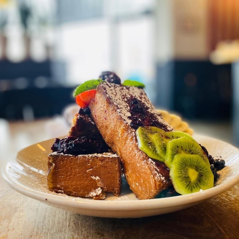 Brioche soaked in nutmeg custard overnight, griddled, baked, and garnished with seasonal compote and fruit.